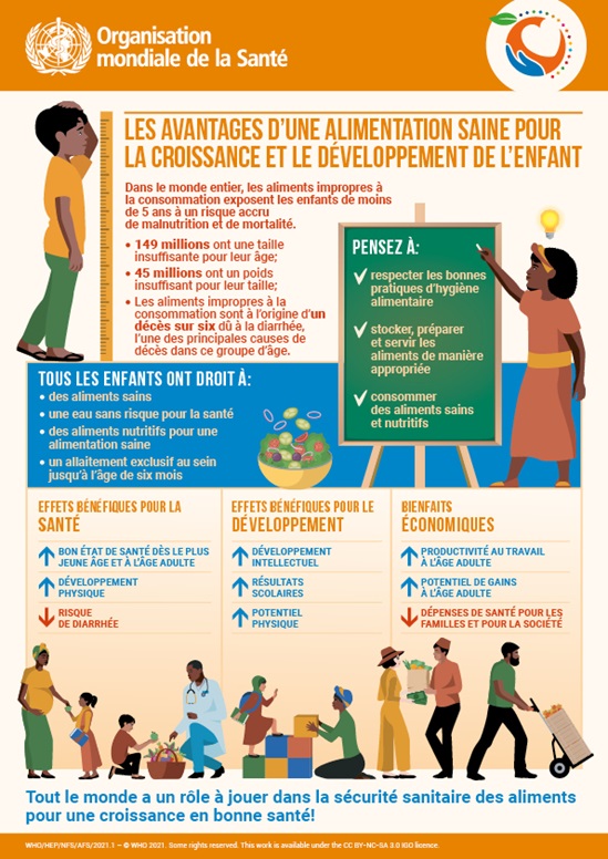 Sous le thème « Des aliments sains pour un avenir sain », la campagne de cette année vise à souligner les effets bénéfiques immédiats et à long terme de la production et de la consommation d’aliments sûrs pour la population, la planète et l’économie. Reconnaître les liens systémiques qui existent entre la santé des êtres humains, des animaux, des plantes, de l’environnement et de l’économie nous aidera à faire face aux besoins de demain.