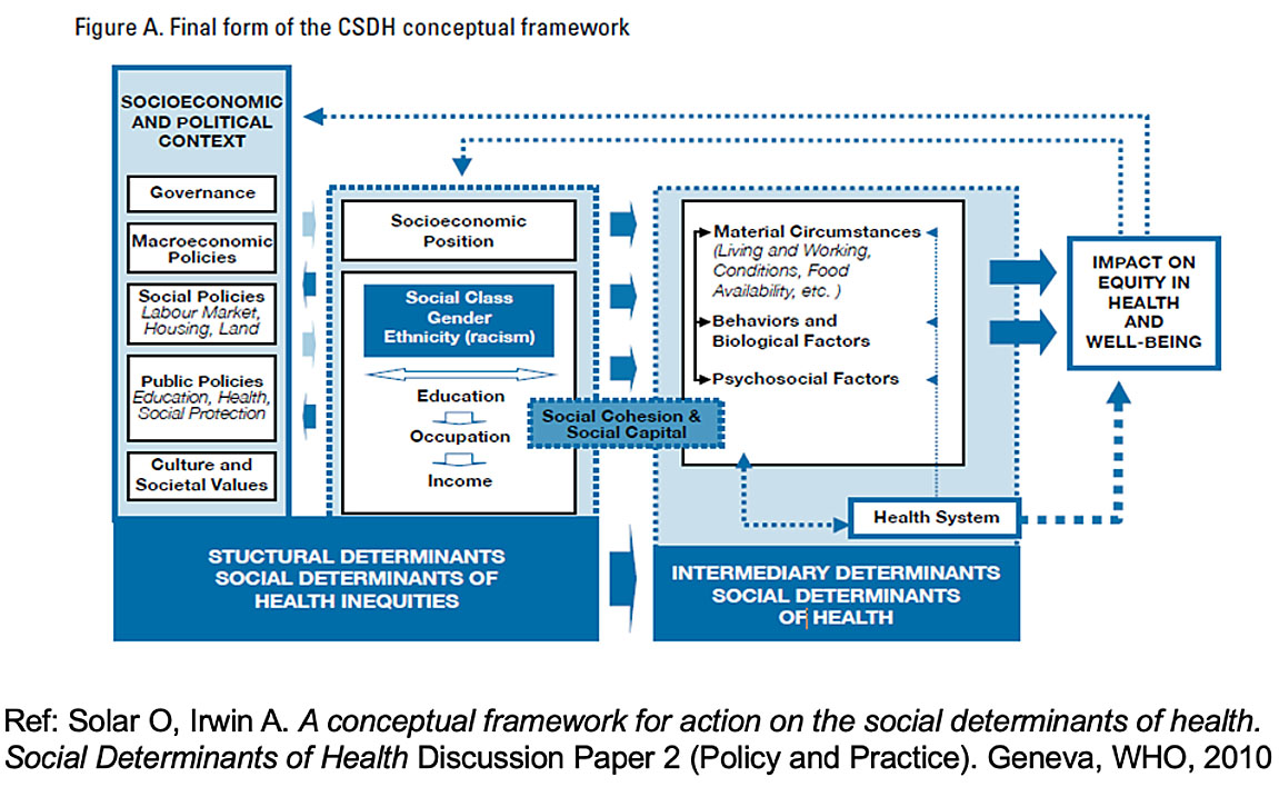 Health and health equity are determined by the conditions in which people are born, grow, live, work, play and age, as well as biological determinants. Structural determinants (political, legal, and economic) with social norms and institutional processes shape the distribution of power and resources determined by the conditions in which people are born, grow, live, work, play and age.
