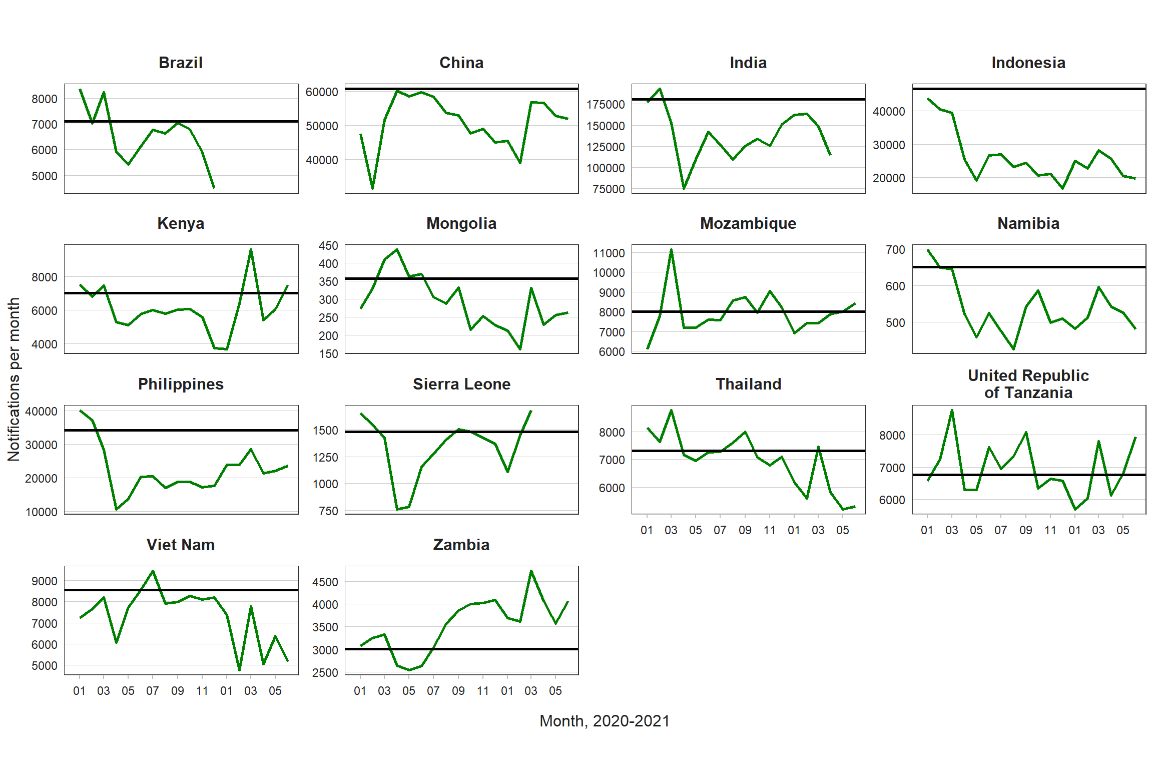 A widely available indicator that can be used to assess the impact of disruptions caused by the COVID-19 pandemic on essential TB services at country level is the national number of monthly or quarterly notifications of people diagnosed with TB. This indicator reflects impacts on access to diagnosis and treatment on both the supply side (e.g. capacity to continue to provide services) and the demand side (e.g. willingness and ability to seek care in the context of lockdowns and associated restrictions on movement, concerns about the risks of going to health care facilities during a pandemic, and stigma associated with similarities in symptoms related to TB and COVID-19). After successfully collecting such data from 14 high TB burden countries for January–June 2020 (1), in January 2021 WHO established a global system for regular collection of monthly and quarterly notification data from more than 100 countries, initially for the whole of 2020 and then for 2021, with visualizations of all reported data available in real time (2–4).