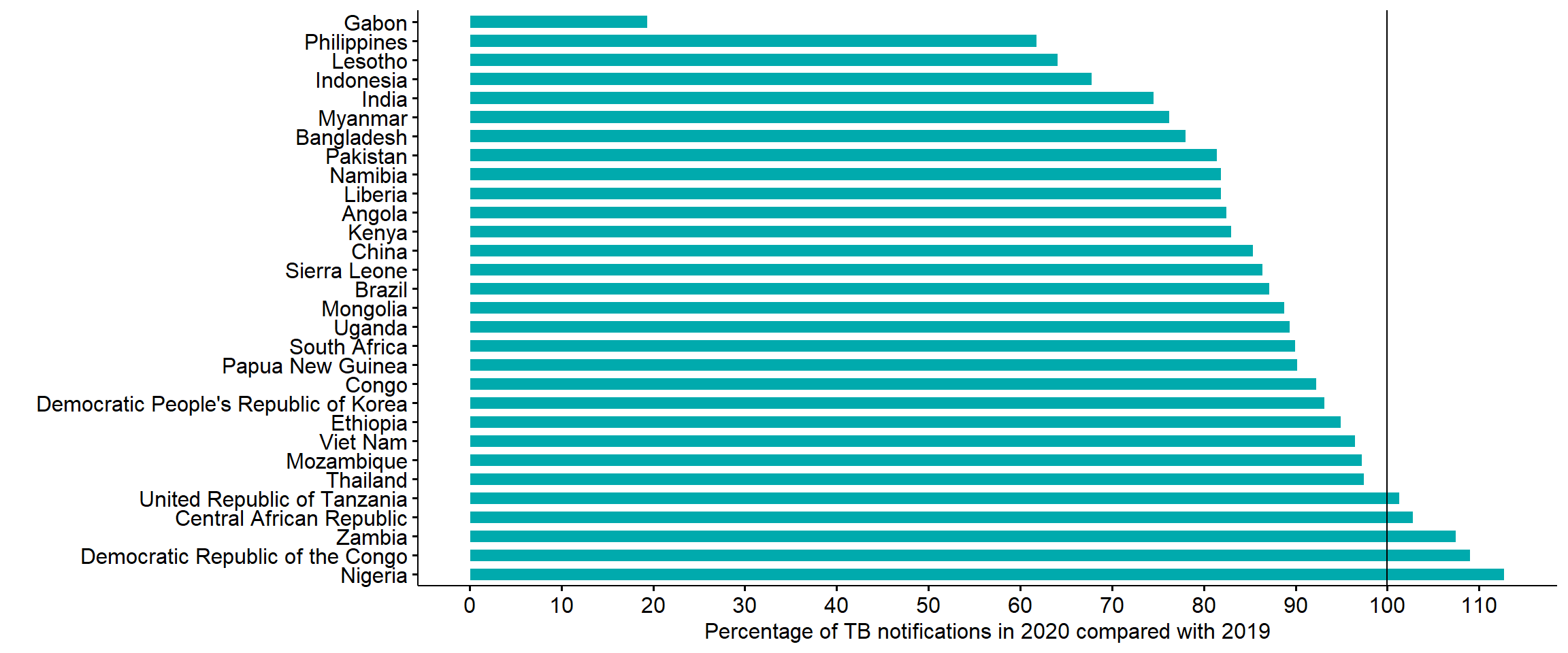 Fig. 1.5 TB notifications in 2020 compared with 2019 in the 30 high TB burden countries