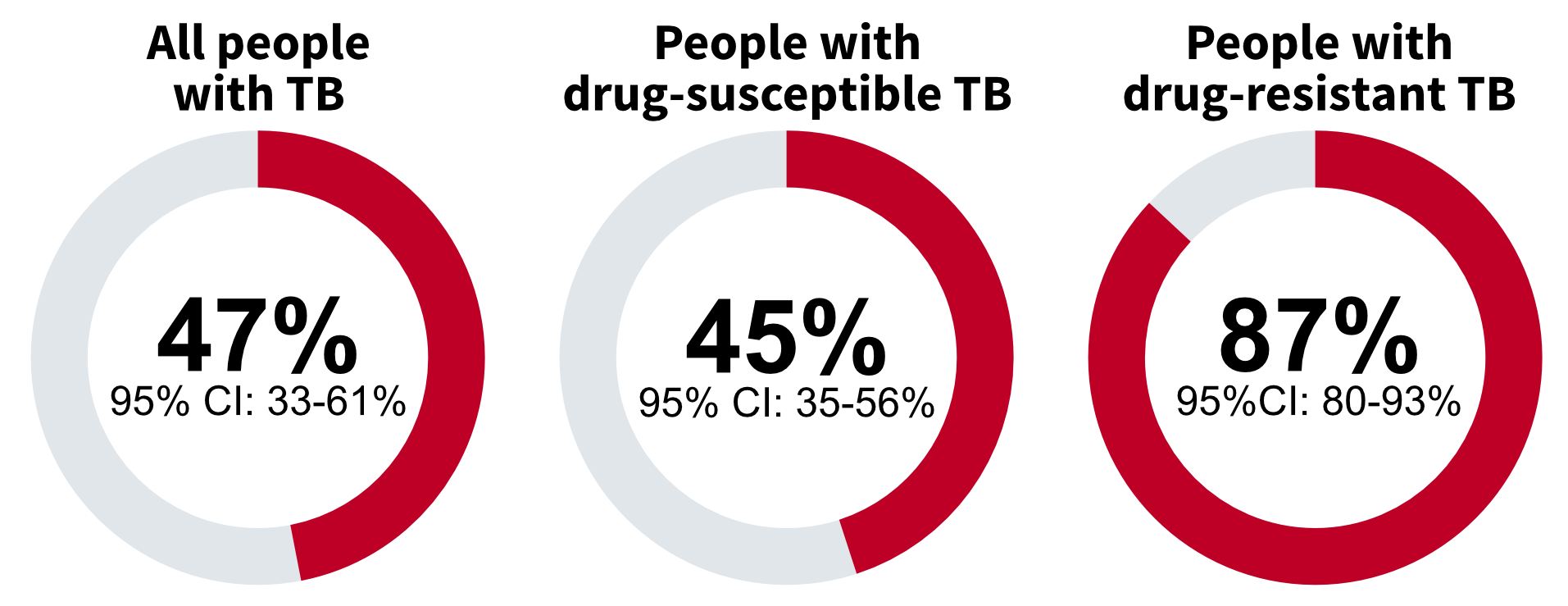 Among 19 countries that reported disaggregated data, the pooled averages were 45% (95% CI: 35–56%) for drug-susceptible TB and 87% (95% CI: 80–93%) for drug-resistant TB (DR-TB) (Fig. 6.2.3). The percentage of TB patients with DR-TB and their households that experienced catastrophic total costs ranged from 50% (95% CI: 14–86%) in Burkina Faso to 100% (95% CI: 92–100%) in Uganda.
