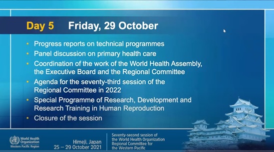 Day 5: Venue of the 72nd session of the WHO Regional Committee for the Western Pacific at Arcrea Himeji Culture and Convention Center, Himeji, Japan, 25-29 October 2021.