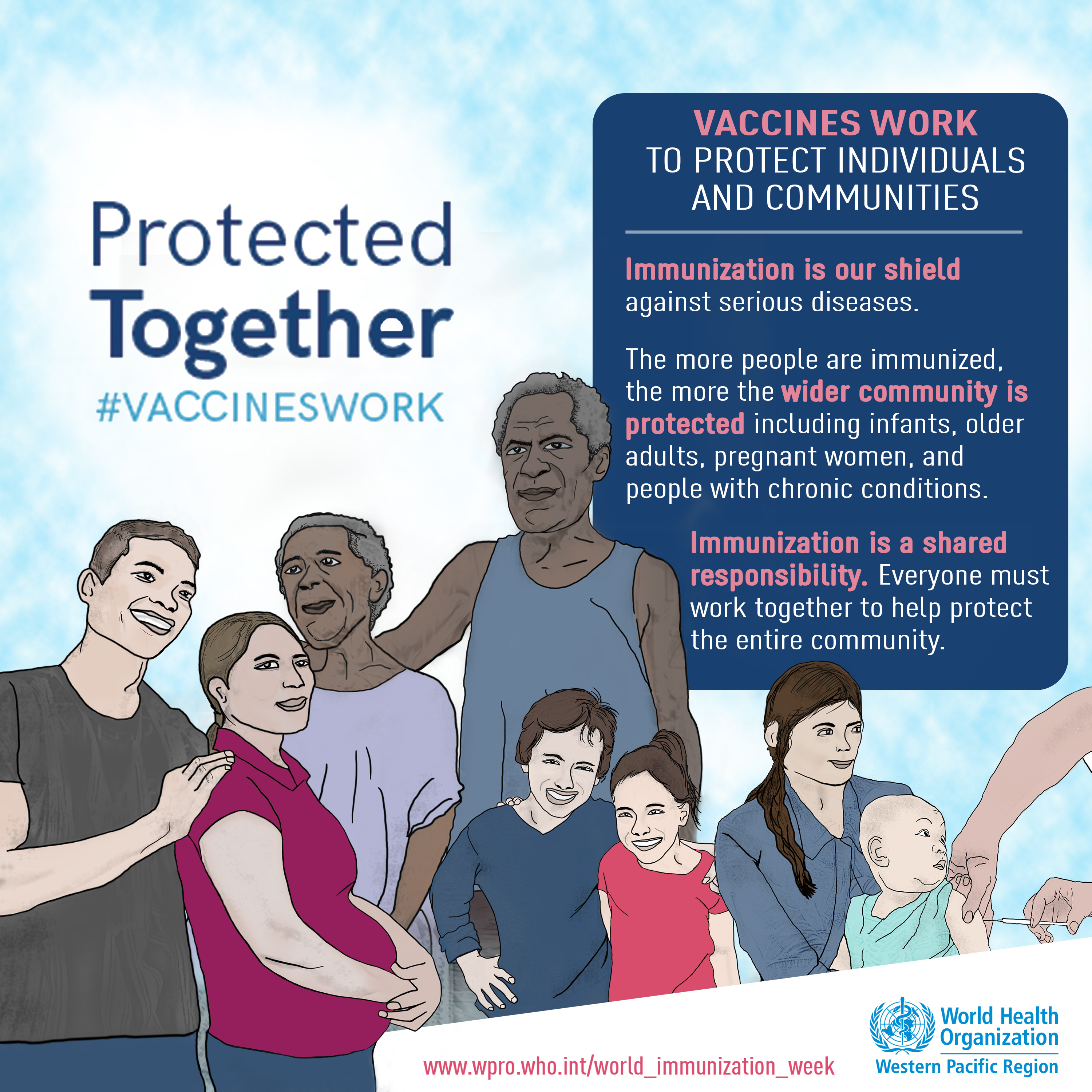The goal of World Immunization Week 2018 is to urge greater action on immunization, with particular focus on highlighting the role that everyone can play in this effort: parents, health-care workers, policy-makers, media, and ultimately everyone, to work together to ensure that every child in every country gets the vaccines they need. This year’s theme: “Protected Together, #VaccinesWork”, encourages people at every level, from policy makers to parents, to go further in their efforts to increase immunization coverage for the greater good.